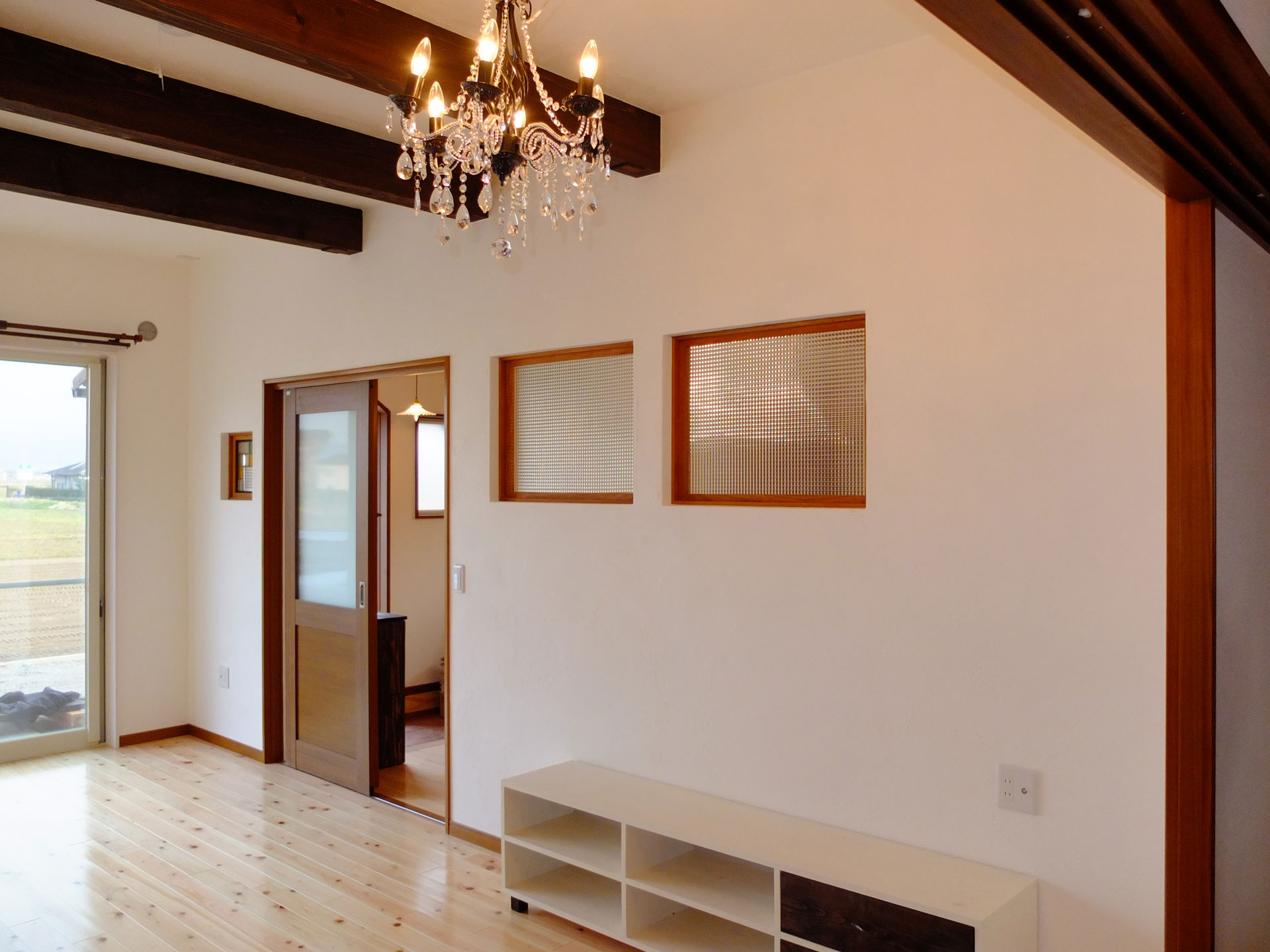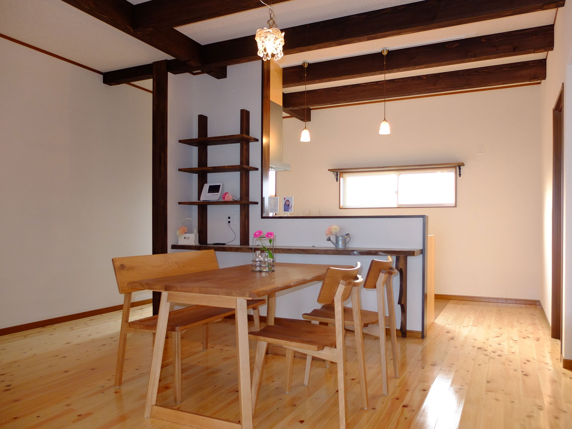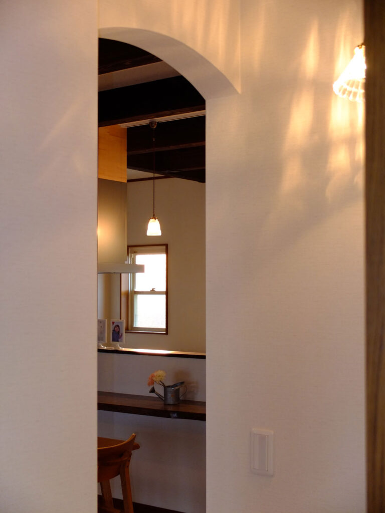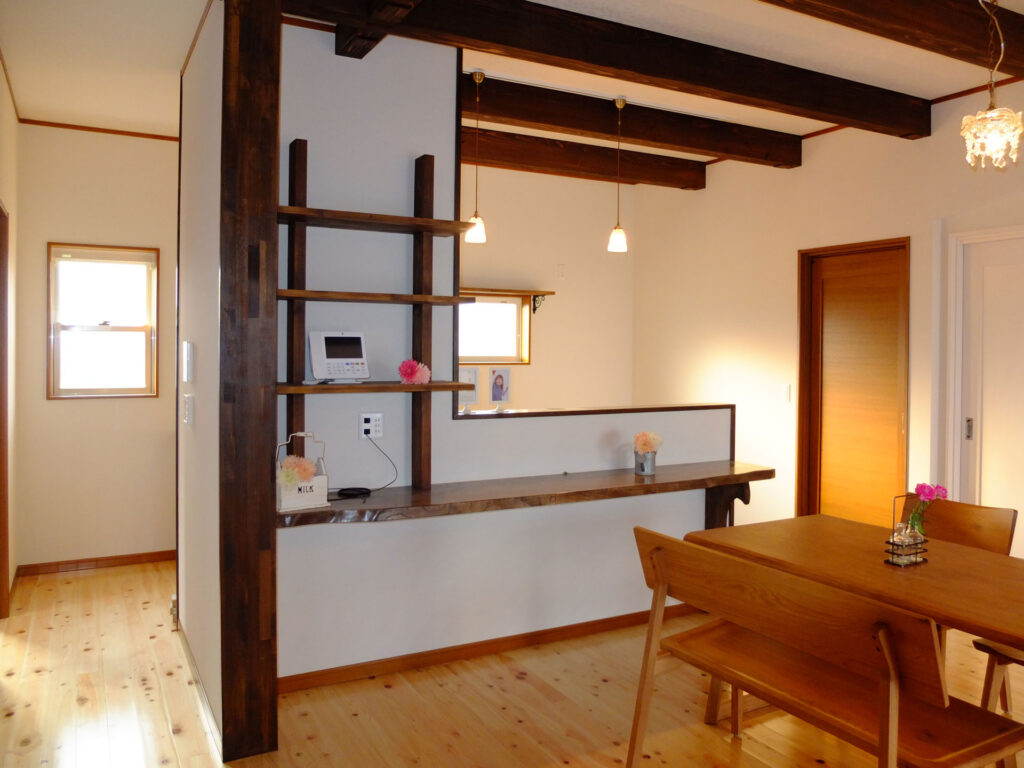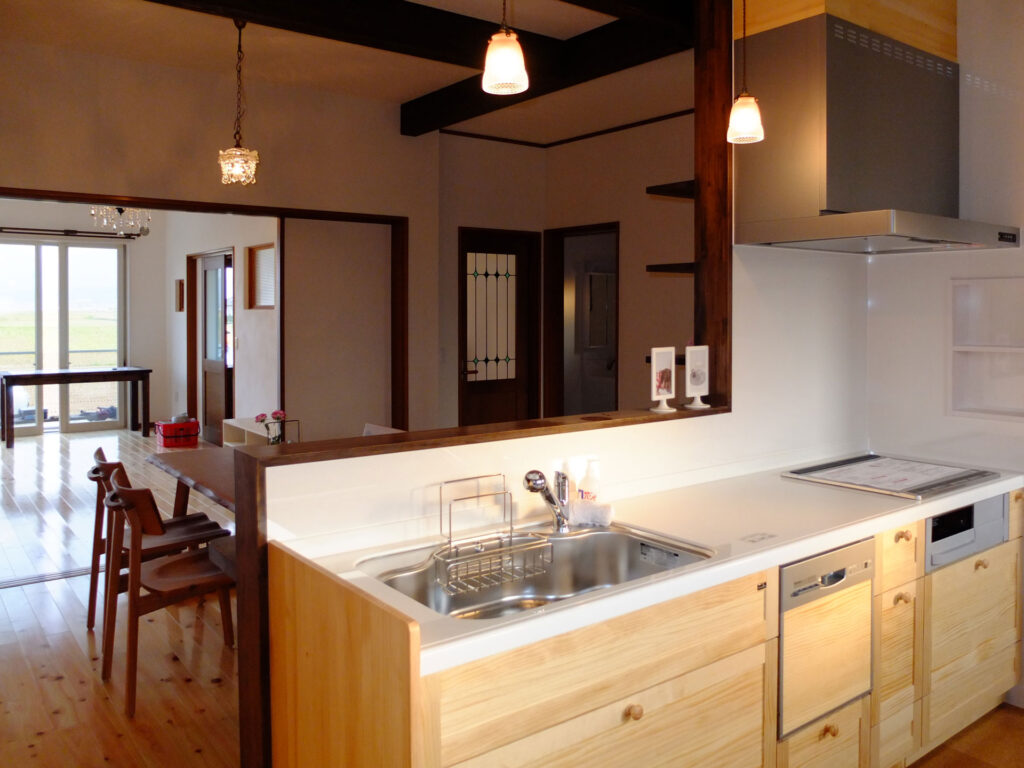 キッチンは大好きな自然素材で可愛く。家族の表情も大好きな阿蘇の自然も眺められます。